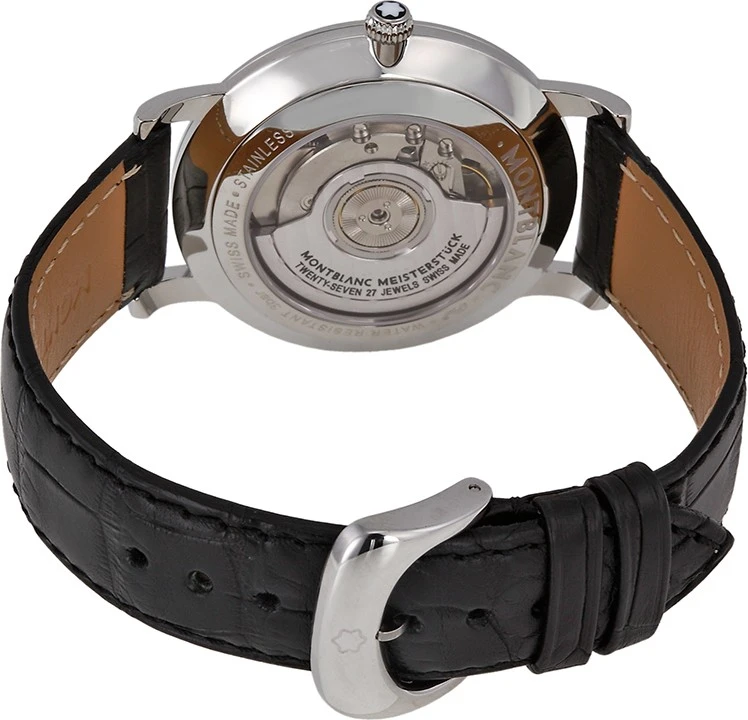 Vỏ thép không gỉ với dây đeo bằng da màu đen.