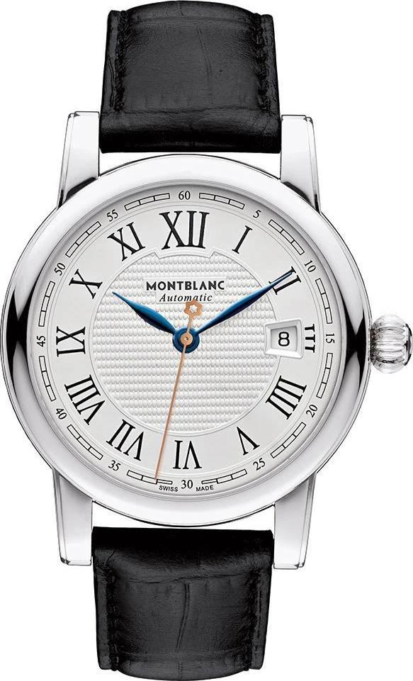 Mặt số màu trắng với kim màu xanh và vạch số giờ La Mã.
