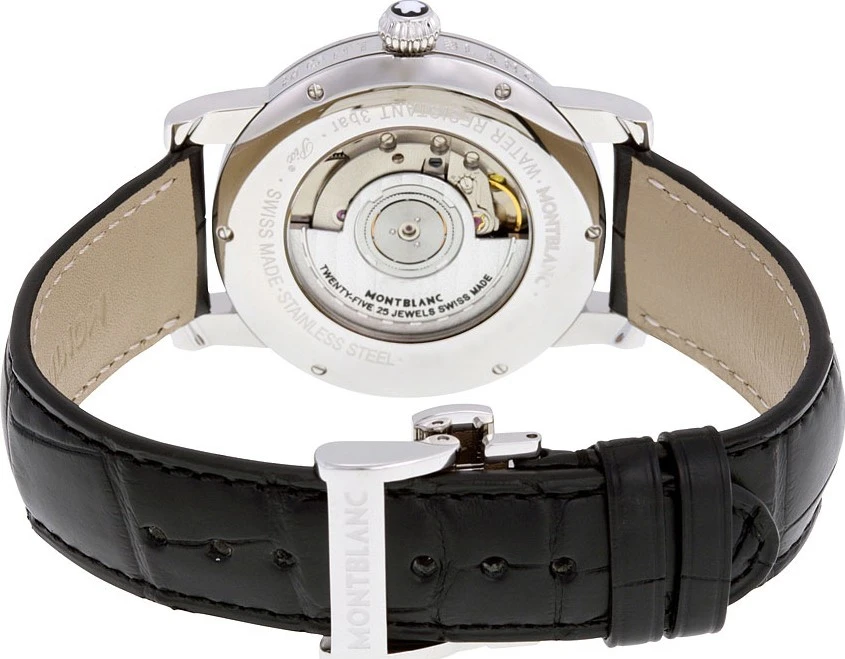 Vỏ thép không gỉ với dây đeo bằng da màu đen.