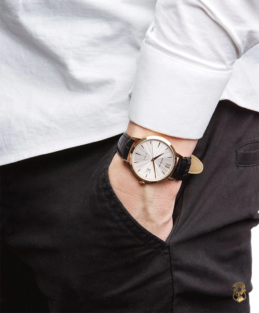 Mặt số: Mặt số guilloché màu trắng bạc với chữ số và cọc số La Mã mạ vàng đỏ