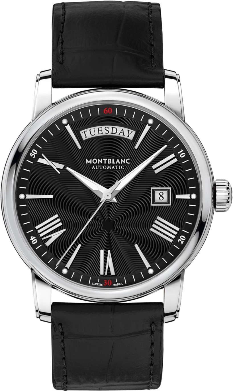 Montblanc 4810 Day-Date kết hợp chức năng hữu ích với sự tinh tế tinh tế. Bộ máy Calibre MB 24.18 của nó cung cấp chỉ báo thứ và thứ trong các cửa sổ riêng biệt. Cả hai đều được sắp xếp hài hòa trên mặt số màu đen được tô điểm bởi họa tiết guilloché ngôi sao nổ phát ra từ vị trí 6 giờ. Cửa sổ hiển thị ngày hình vòm nằm ở vị trí giữa 11 và 1 giờ. Một cửa sổ hình chữ nhật ở vị trí 3 giờ hiển thị ngày. Mặt số được bao quanh bởi một đường kim phút chính xác với các chấm SuperLumiNova® ở giờ lẻ và vạch 30 và 60 giây được đánh dấu màu đỏ. Được bổ sung bằng dây đeo bằng da cá sấu màu đen, vỏ 40,5 mm được làm bằng thép không gỉ với các sừng tròn và đường viền bezel hoàn thiện bằng sa tanh nhấn mạnh sự tinh tế cổ điển của chiếc đồng hồ.