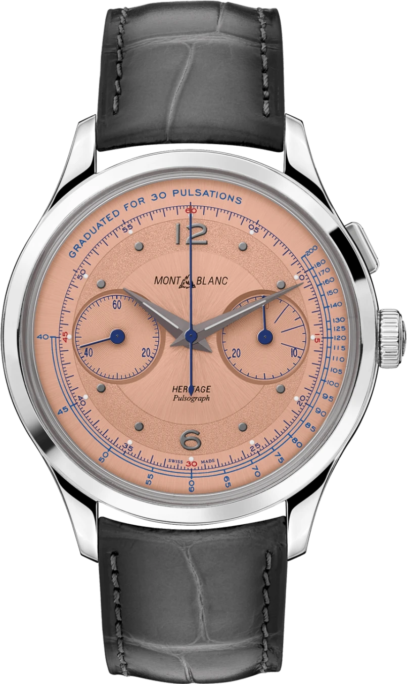 Lấy cảm hứng từ những chiếc đồng hồ đeo tay cổ điển Minerva lịch sử từ những năm 1940 và 1950, dòng sản phẩm Heritage kết hợp sự sang trọng của quá khứ chế tạo đồng hồ với các quy tắc và công nghệ thiết kế táo bạo ngày nay. Montblanc Heritage Pulsograph Limited Edition 100 được lấy cảm hứng từ cái mà các nhà sưu tập gọi là 'đồng hồ bác sĩ', loại đồng hồ được các bác sĩ trước đây sử dụng để kiểm tra nhịp tim của bệnh nhân. Chiếc đồng hồ 40 mm này được làm bằng thép và được cung cấp năng lượng bởi đồng hồ bấm giờ đơn nút bấm Montblanc Manufacturing cỡ nòng MB M13.21 có thể nhìn thấy qua vỏ sau và bao gồm chỉ báo xung nhịp của bác sĩ được chia độ cho 30 xung. Mặt số hình vòm màu cá hồi trang nhã của nó có một số mã thiết kế cổ điển có thể thấy trên đồng hồ đeo tay Minerva từ những năm 1940 và 50.