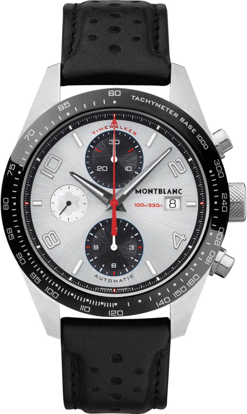 Dòng sản phẩm Montblanc TimeWalker tượng trưng cho tinh thần đua xe và gợi nhớ lại những nhạc cụ vinh quang này bằng dòng đồng hồ chuyên nghiệp mới. Dòng sản phẩm tìm thấy nguồn cảm hứng từ những chiếc đồng hồ từ lịch sử nổi bật của Minerva. Dòng sản phẩm TimeWalker kết hợp những công cụ đo thời gian huyền thoại trong quá khứ với tinh thần đua xe, gói gọn di sản, công nghệ Minerva và những ngày huy hoàng của phong cách đua xe. Đồng hồ bấm giờ tự động TimeWalker có vỏ bằng thép không gỉ 41 mm nổi bật với các sừng được hoàn thiện bằng sa tanh với các cạnh có kiến trúc và chạm khắc được vát ở các cạnh để tạo đường nét mượt mà. Mang tinh thần đua xe, mẫu này được trang bị thang đo tốc độ tachymeter thực tế để đo thời gian tốc độ được biểu thị trên khung bezel gốm cố định. Chiếc đồng hồ này có mặt số “gấu trúc” với nền màu trắng bạc tương phản, các bộ đếm và mặt bích màu đen ở vị trí 6 và 12 giờ. Đồng hồ có các chữ số và chỉ số Super-LumiNova*, cũng như vạch phút chính xác trên mặt bích cũng được cải tiến bằng cả Super-LumiNova và vạch dấu màu đỏ cho mốc 15 phút để có mức độ dễ đọc tối đa.