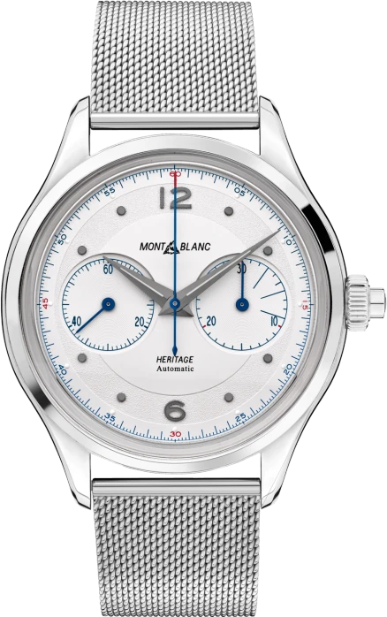 Lấy cảm hứng từ những chiếc đồng hồ đeo tay cổ điển Minerva lịch sử từ những năm 1940 và 1950, dòng sản phẩm Heritage kết hợp sự sang trọng của quá khứ chế tạo đồng hồ với các quy tắc và công nghệ thiết kế táo bạo ngày nay. Montblanc Heritage Monopizer Chronograph có thiết kế đồng hồ bấm giờ mới nhất trong dòng sản phẩm Montblanc với mặt số hình vòm màu trắng bạc với hai lớp hoàn thiện khác nhau, mang lại cho chiếc đồng hồ vẻ đẹp thanh lịch và tinh tế. Nhìn kỹ hơn vào bộ đếm phút ở vị trí 3 giờ, bạn sẽ thấy chỉ báo 3, 6 và 9 phút—một nét cổ điển từ thời chúng ta còn sử dụng điện thoại chạy bằng tiền xu và cần theo dõi thời lượng cũng như chi phí của một cuộc gọi. Chiếc đồng hồ 42 mm này có vỏ bằng thép không gỉ được đánh bóng hoàn toàn với các sừng cong, hộp bằng kính sapphire hình vòm và dòng chữ Minerva Manufacturing dập nổi trên vỏ sau. Chiếc đồng hồ được hoàn thiện với dây đeo bằng thép của Milanese.