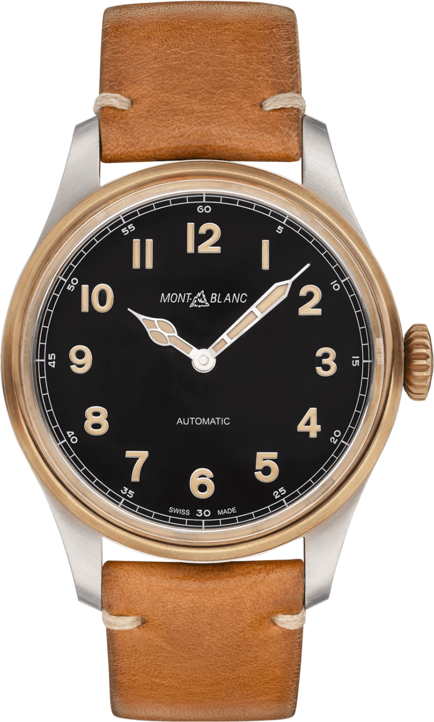 Bộ sưu tập Montblanc 1858 tiếp tục tái hiện lại những chiếc đồng hồ bấm giờ Minerva nổi tiếng từ những năm 1930, với những thiết kế khác biệt và cơ chế đặc biệt vượt thời gian. Phong cách cổ điển của bộ sưu tập đã được nâng cao hơn nữa nhờ sự ra đời của đồng - sản phẩm đầu tiên của Maison. Thông qua việc lựa chọn kim loại này, Montblanc kết hợp chế tạo đồng hồ thủ công truyền thống của Thụy Sĩ với chất liệu chính hãng từ lịch sử chế tạo đồng hồ. Lần đầu tiên trong ngành chế tạo đồng hồ, đồng được kết hợp với thép và tạo ra sự kết hợp hai chất liệu, hai màu sắc mang lại những gì tốt nhất cho thiết kế cổ điển. Montblanc 1858 Automation có mặt số màu đen đậm mang lại lớp sơn hoàn hảo cho các kim hình thánh đường và các chữ số Ả Rập đã được cải tiến bằng Super-LumiNova® màu be để có thể đọc dễ dàng vào ban đêm. Vỏ 44 mm được làm bằng thép không gỉ phủ satin, trong khi viền và núm vặn được sản xuất bằng đồng. Mặt sau của vỏ đồng hồ có hình khắc của Nhà sản xuất Minerva ở Villeret, với nền là Dãy núi Jura. Ngoài ra còn có logo Roberts Frères Villeret, logo Minerva lịch sử, tên Montblanc và mũi tên từ ngọn giáo của Nữ thần Minerva. Đồng hồ được trang bị bộ máy MB 24.15 cỡ nòng, một bộ chuyển động tự động chính xác dành cho những người đam mê đồng hồ trẻ và hiện đại, những người đánh giá cao cả vẻ ngoài cổ điển và chức năng chế tác đồng hồ. Chiếc đồng hồ này được hoàn thiện bằng dây đeo bằng da bê màu cognac hoàn toàn mới với những đường khâu màu be được chế tác bởi Montblanc Pelletteria ở Florence.