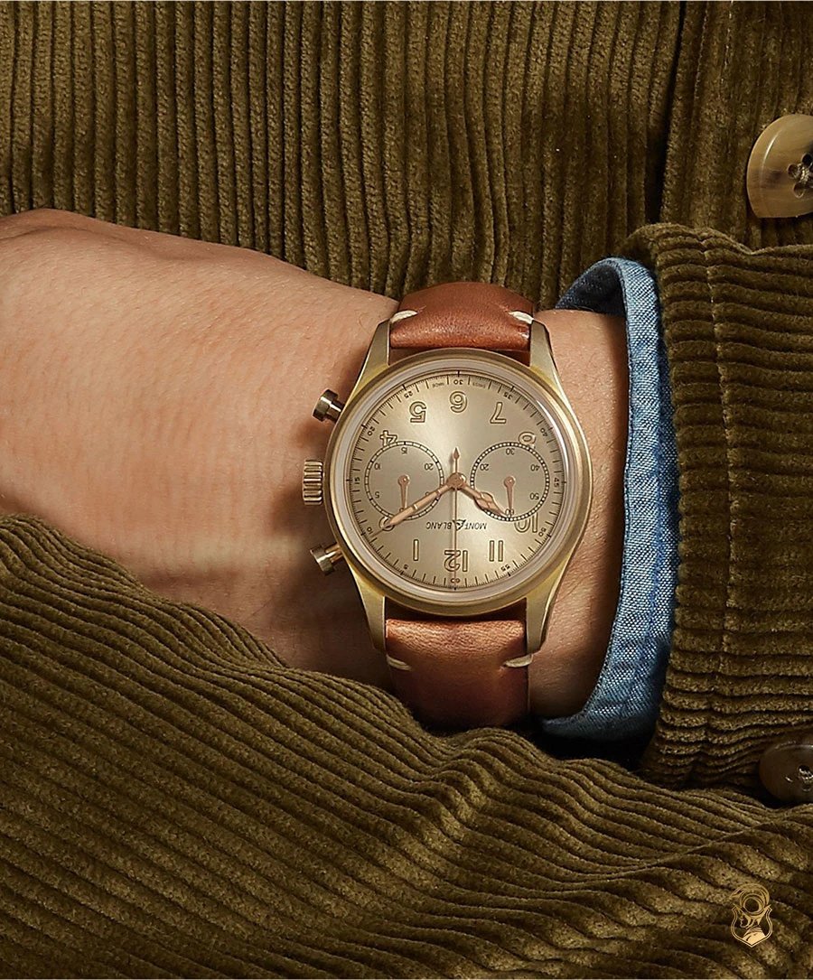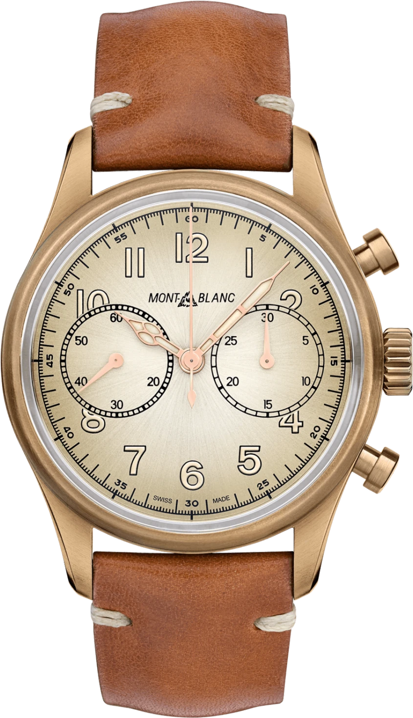 Đồng hồ bấm giờ tự động Montblanc 1858 kết hợp tính thẩm mỹ thuần túy với chức năng và tự hào về độ chính xác của các chức năng bấm giờ. Lần đầu tiên, Montblanc 1858 Automation Chronograph giới thiệu nút bấm hai nút trên dây chuyền để kích hoạt đồng hồ bấm giờ. Vỏ 42 mm của nó đã trải qua cả quá trình hoàn thiện đánh bóng và sa tanh, đồng thời đi kèm với hộp kính bằng pha lê sapphire, làm nổi bật sự mạnh mẽ và vẻ ngoài hiện đại của đồng hồ. Được khắc trên mặt sau vỏ là một chiếc la bàn, hai chiếc cuốc băng bắt chéo và ngọn núi Mont Blanc mang tính biểu tượng – đỉnh núi mang tính biểu tượng đã truyền cảm hứng cho Maison kể từ khi thành lập. Mặt đồng hồ màu sâm panh hun khói với lớp hoàn thiện tia nắng mang đến phông nền trang nhã cho bộ đếm bi-la bàn ở vị trí 3 và 9 giờ, gợi nhớ đến đồng hồ bấm giờ lịch sử của Minerva.