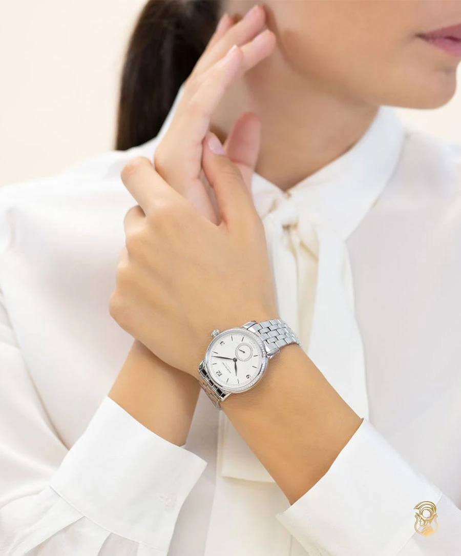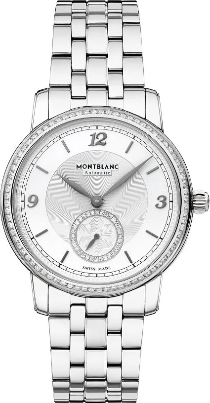 Lấy cảm hứng từ di sản Minerva đặc biệt có từ năm 1858, Montblanc giới thiệu đồng hồ nữ trong Bộ sưu tập Star Legacy, kết hợp nét nữ tính với tinh thần chế tác đồng hồ cổ điển. Montblanc Star Legacy Small Second có vỏ bằng thép không gỉ 36 mm với đường cong ở các cạnh, tạo cho đồng hồ một hình dạng tinh tế và hiệu ứng đá cuội, cùng với các sừng có các bậc ở hai bên. Viền được nạm 76 viên kim cương (~0,5624 ct), mang đến sự tinh tế tối đa. Theo tinh thần chế tạo đồng hồ cổ điển, núm vặn nổi bật với hình dạng củ hành dễ nhận biết và dễ cầm, được trang trí bên hông bằng biểu tượng Montblanc mang tính biểu tượng bằng xà cừ. Mặt số màu trắng bạc nổi bật với họa tiết guilloché ngôi sao nổ của Maison ở trung tâm và được làm nổi bật bằng các chữ số Ả Rập màu antraxit nổi bật ở vị trí 3, 9 và 12 giờ. Vào lúc 6 giờ, một chiếc nhẫn kim cương trang nhã bao quanh bộ đếm giây nhỏ được đính 32 viên kim cương (~0,064 ct) và có họa tiết guilloché ngôi sao nổ Montblanc nhỏ hơn