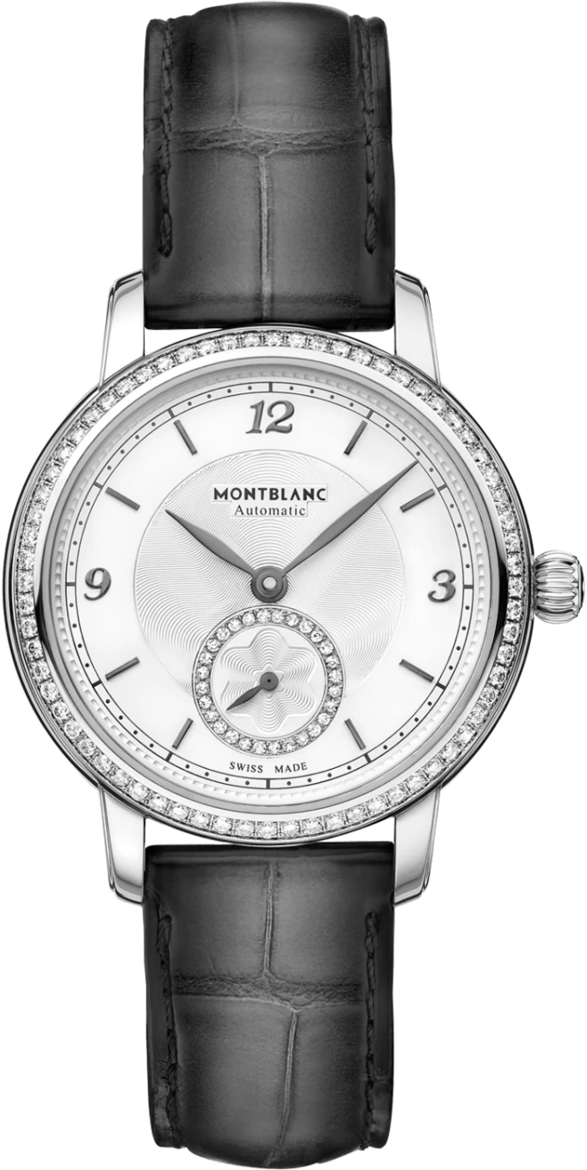 Lấy cảm hứng từ di sản Minerva đặc biệt có từ năm 1858, Montblanc giới thiệu đồng hồ nữ trong Bộ sưu tập Star Legacy, kết hợp giữa nét nữ tính với tinh thần chế tác đồng hồ cổ điển. Montblanc Star Legacy Small Second có vỏ bằng thép không gỉ 32 mm với đường cong ở các cạnh, tạo cho đồng hồ một hình dạng tinh tế và hiệu ứng đá cuội, cùng với các sừng có các bậc ở hai bên. Viền được nạm 68 viên kim cương (~0,5032 ct), mang lại sự tinh tế tối đa. Theo tinh thần chế tạo đồng hồ cổ điển, núm vặn nổi bật với hình dạng củ hành dễ nhận biết và dễ cầm, được trang trí bên hông bằng biểu tượng Montblanc mang tính biểu tượng bằng xà cừ. Mặt số màu trắng bạc nổi bật với họa tiết guilloché ngôi sao nổ của Maison ở trung tâm và được làm nổi bật bằng các chữ số Ả Rập màu antraxit nổi bật ở vị trí 3, 9 và 12 giờ. Vào lúc 6 giờ, một chiếc nhẫn kim cương trang nhã bao quanh bộ đếm giây nhỏ được đính 28 viên kim cương (~0,056 ct) và có họa tiết guilloché ngôi sao nổ Montblanc nhỏ hơn. Chiếc đồng hồ này được hoàn thiện với dây đeo bằng da cá sấu sfumato màu xám đậm mới từ Montblanc Pelletteria ở Florence, Ý.