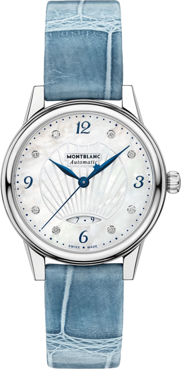 Montblanc Bohème Automation kết hợp những gì tinh tế nhất của chế tạo đồng hồ với thiết kế nữ tính đặc biệt. Chiếc đồng hồ này biểu thị giờ, phút và giây với kim màu xanh lam hình chiếc lá và hình dùi cui truyền thống, đồng thời hiển thị ngày thông qua lỗ mở hình elip độc đáo ở vị trí sáu giờ. Mặt số xà cừ tinh tế nổi bật với các chữ số Ả Rập in hoa màu xanh lam và các cọc số kim cương. Một chấm nhỏ màu xanh lam tinh tế và thoáng mát bao quanh trung tâm guilloché vỏ sò quý giá với 60 mặt và đường viền guilloché duyên dáng. Đồng hồ có vỏ bằng thép không gỉ 30 mm có tích hợp còi và mặt sau bằng kính sapphire. Dây đeo bằng da cá sấu jean màu xanh mới với cơ chế có thể hoán đổi giúp hoàn thiện vẻ ngoài đầy màu sắc của chiếc đồng hồ thanh lịch và tinh tế này.