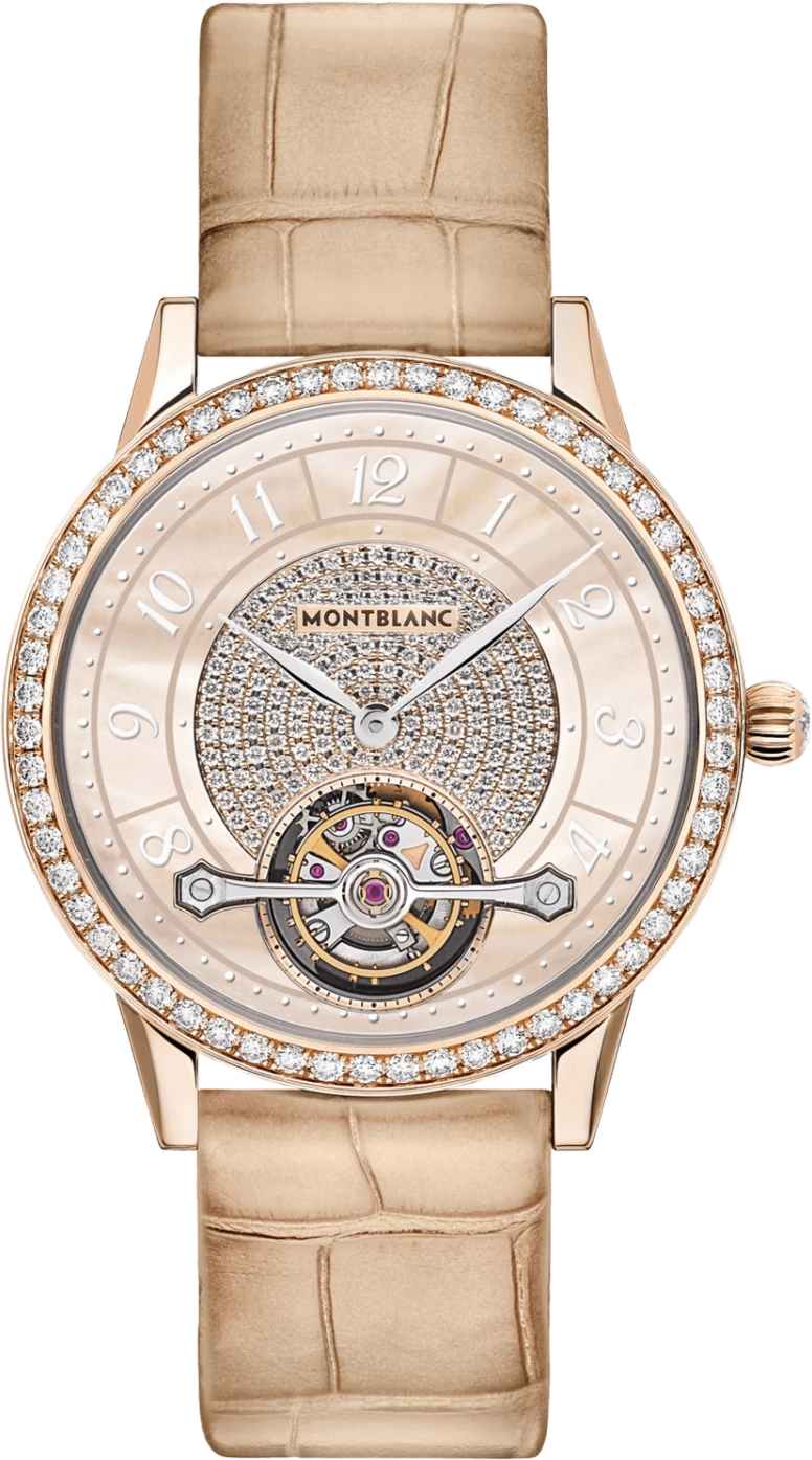 Độ chính xác chế tạo đồng hồ cao nhất kết hợp với vẻ lộng lẫy nữ tính trong chiếc đồng hồ đầy sự tương phản tinh tế này. Trong phiên bản này giới hạn 28 chiếc, vàng hồng, màu be và kim cương lấp lánh nhấn mạnh sự khéo léo tinh tế của cỡ nòng MB 29.24 được phát triển và sản xuất nội bộ, có tính năng Exo Tourbillon được cấp bằng sáng chế của Montblanc và cơ chế dừng giây nhanh. Vẻ sang trọng nguyên sơ của chỉ báo thời gian hai kim ở trung tâm trên các chữ số Ả Rập in hoa tương phản với kiệt tác cơ học của chức năng Exo Tourbillon nằm ở vị trí 6 giờ. Với hai tông màu sang trọng, mặt ngoài của mặt số được chế tác từ xà cừ màu be, trong khi phần trung tâm được lát đồng tâm bằng 146 viên kim cương lấp lánh. Nhìn thoáng qua mặt sau của vỏ bằng tinh thể sapphire, bạn có thể thấy được sự khéo léo tinh xảo hơn nữa: rôto siêu nhỏ của bộ chuyển động được trang trí bằng lớp hoàn thiện “Côtes de Genève” với các sọc hình quạt đặc trưng. Được thiết kế để phù hợp với cổ tay thanh tú với kích thước 38 mm rất mỏng, vỏ làm bằng vàng hồng 18 K được bao bọc bởi một vành bezel được nạm 58 viên kim cương. Một viên kim cương có hình biểu tượng Montblanc tô điểm cho núm vặn ở vị trí 3 giờ, trong khi một viên kim cương khác tô điểm cho khóa chốt bằng vàng hồng 18K trên dây đeo bằng da cá sấu màu be phù hợp với màu của mặt số. Để có độ tin cậy và hiệu suất tối đa, chiếc đồng hồ này đã được kiểm tra nghiêm ngặt bởi Phòng thí nghiệm Montblanc Test 500.