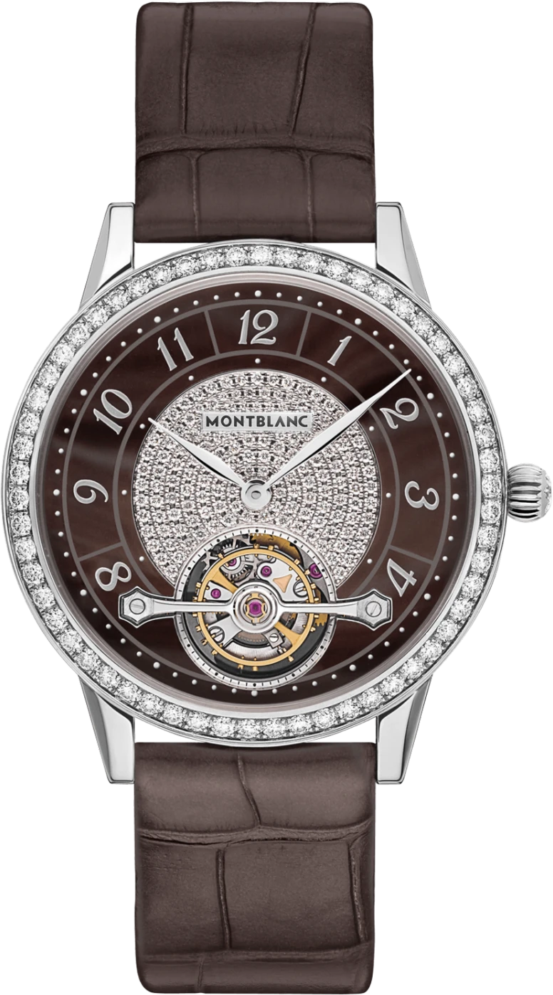 Độ chính xác chế tạo đồng hồ cao nhất kết hợp với vẻ lộng lẫy nữ tính trong chiếc đồng hồ đầy sự tương phản tinh tế này. Trong phiên bản này giới hạn 28 chiếc, vàng trắng, xám đá phiến và kim cương lấp lánh nhấn mạnh sự khéo léo tinh tế của cỡ nòng MB 29.24 được phát triển và sản xuất nội bộ, có tính năng Exo Tourbillon đã được cấp bằng sáng chế của Montblanc và cơ chế dừng giây nhanh. Vẻ sang trọng nguyên sơ của chỉ báo thời gian hai kim ở trung tâm trên các chữ số Ả Rập in hoa tương phản với kiệt tác cơ học của chức năng Exo Tourbillon nằm ở vị trí 6 giờ. Với hai tông màu sang trọng, mặt ngoài của mặt số được chế tác từ xà cừ màu xám đá phiến, trong khi phần trung tâm được lát đồng tâm bằng 146 viên kim cương lấp lánh. Nhìn thoáng qua mặt sau của vỏ bằng tinh thể sapphire, bạn có thể thấy được sự khéo léo tinh tế hơn nữa: rôto siêu nhỏ của bộ chuyển động được trang trí bằng lớp hoàn thiện “Côtes de Genève” với các sọc hình quạt đặc trưng. Được thiết kế để phù hợp với cổ tay thanh tú với kích thước 38 mm rất mỏng, vỏ được làm bằng vàng trắng 18 K, trên cùng là viền bezel được nạm 58 viên kim cương. Một viên kim cương có hình biểu tượng Montblanc tô điểm cho núm vặn ở vị trí 3 giờ, trong khi một viên kim cương khác tô điểm cho khóa chốt bằng vàng trắng 18K trên dây đeo bằng da cá sấu màu xám phù hợp với màu của mặt số. Để có độ tin cậy và hiệu suất tối đa, chiếc đồng hồ này đã được kiểm tra nghiêm ngặt bởi Phòng thí nghiệm Montblanc Test 500.