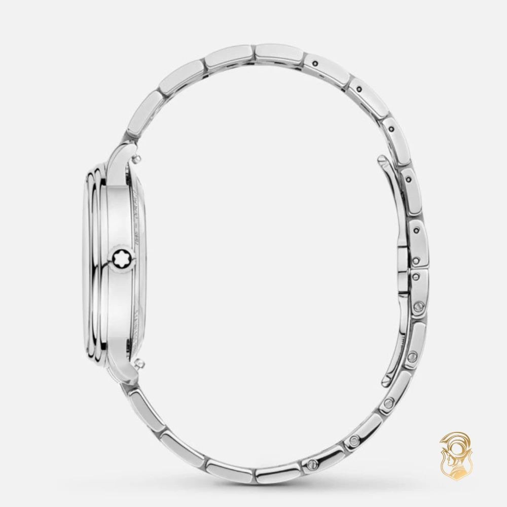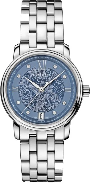 Montblanc Tradition Automatic Date có vỏ thép không gỉ 32 mm với sừng thẳng và vành bezel hình đôi. Đồng hồ có mặt số màu xanh lam mô tả địa hình của Mont Blanc với các vạch chỉ giờ bằng kim cương, số La Mã màu bạc và số La Mã “XII” nổi bật. Kim giờ và phút hình thanh kiếm, kim giây và núm điều chỉnh có biểu tượng Montblanc và dây đeo bằng thép không gỉ có thể thay thế hoàn thiện vẻ ngoài thanh lịch đương đại của nó.