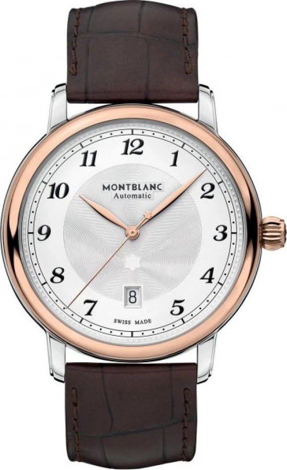 Đồng hồ cao cấp Mont Blanc. Đồng hồ có chức năng lịch ngày. Thông số cơ bản của đồng hồ là: màu mặt số trắng và bạc, loại chuyển động là đồng hồ cơ lên dây tự động, chất liệu dây đeo là da và khả năng chống nước là 30 m.