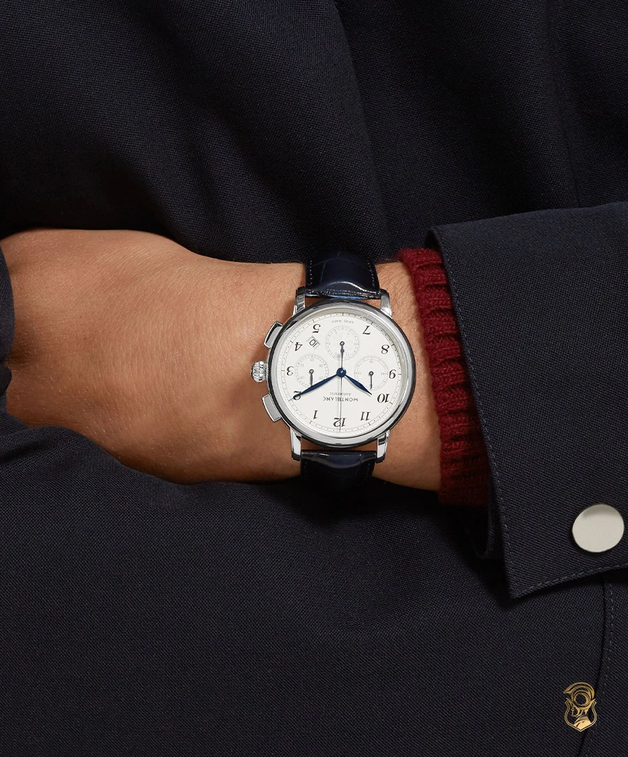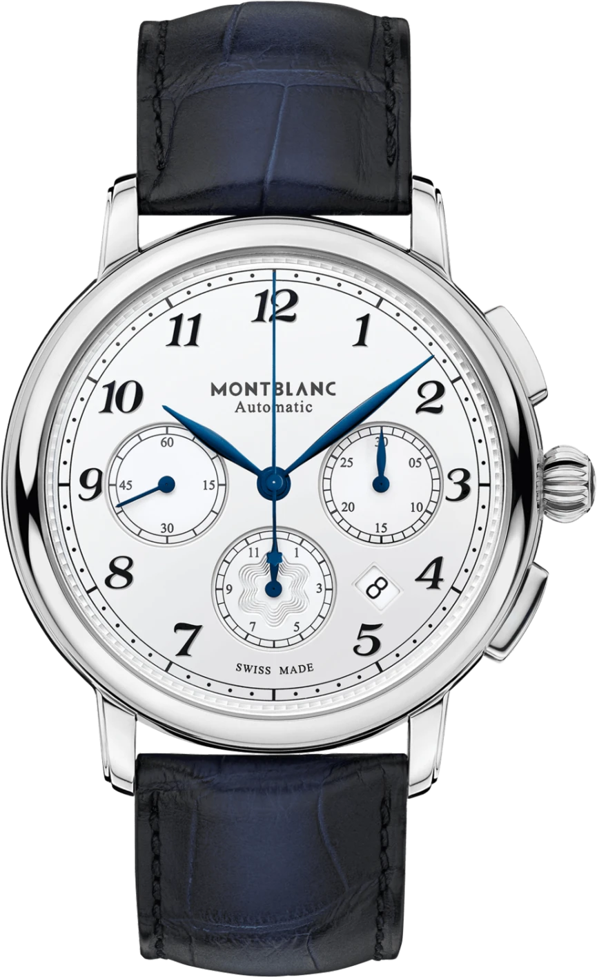 Các quy tắc thiết kế thẩm mỹ của Star Legacy Auto Chronograph ám chỉ lịch sử chế tạo đồng hồ cổ điển và di sản Minerva, kết hợp chúng với chức năng bấm giờ thực tế. Mặt số màu trắng bạc tinh khiết có tỷ lệ cân bằng giữa các yếu tố thẩm mỹ và chức năng hiển thị giờ hiện hành. Nó có các chữ số Ả Rập màu đen được thiết kế lại, các kim hình chiếc lá màu xanh cổ điển và một miếng thịt thăn xào tinh tế. Đường phút đường sắt độc đáo bao quanh mặt số và các bộ đếm hoàn thiện thiết kế trang nhã lịch sử của chiếc đồng hồ. Đồng hồ có vỏ tròn bằng thép không gỉ đường kính 42 mm với các sừng và bậc thang cong ở bên cạnh, vương miện hình củ hành với biểu tượng Montblanc và đường hoàn thiện cong ở mặt bên của vỏ, tạo hiệu ứng đá cuội tinh tế. Chronograph tự động được hoàn thiện với dây đeo bằng da cá sấu Sfumato màu xanh mới từ Montblanc Pelletteria ở Florence, Ý.