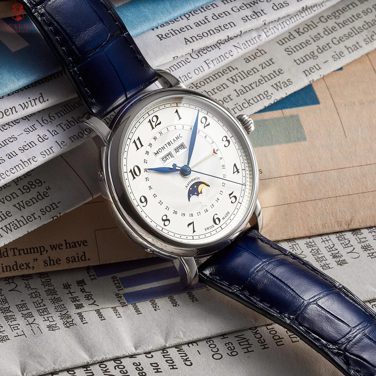 Lịch đầy đủ Montblanc Star Legacy lần đầu tiên gây chú ý với các mã thiết kế thẩm mỹ cho biết giờ, phút và giây kết hợp với ngày, tháng và tuần trăng theo cách đơn giản và thanh lịch nhất. Ngày được biểu thị bằng một kim có hình lưỡi liềm nhỏ màu đỏ quét dọc theo vòng hoa gồm 31 chữ số xung quanh chu vi mặt số. Thứ trong tuần và tháng xuất hiện ở các khẩu độ, trong khi nửa dưới của mặt số được dành riêng cho hiển thị tuần trăng. Quy tắc thiết kế của chiếc đồng hồ thực tế này bắt nguồn trực tiếp từ tinh thần chế tạo đồng hồ cao cấp và dựa trên di sản 160 năm của Minerva. Tất cả mã của bộ sưu tập Star Legacy đều có mặt, bao gồm chữ số Ả Rập, kim hình chiếc lá màu xanh, hoa văn guilloché ngôi sao nổ Montblanc mang tính biểu tượng, đường ray đường sắt độc đáo và guilloché thăn sauté. Mặt số có màu trắng bạc hoàn toàn phù hợp với dây đeo da cá sấu Sfumato màu xanh hoàn toàn mới của Montblanc Pelletteria ở Florence, mang đến sự tinh tế tối đa.