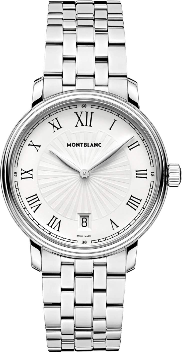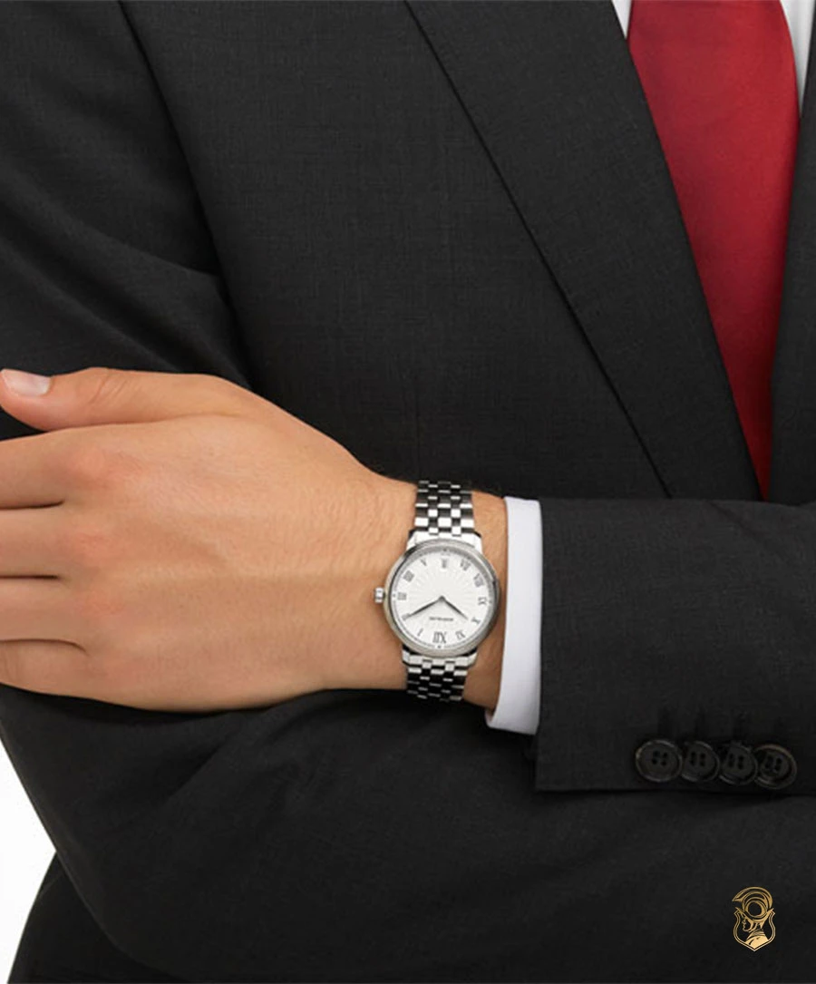 Mặt số guilloche màu trắng với kim màu bạc và vạch số giờ La Mã.