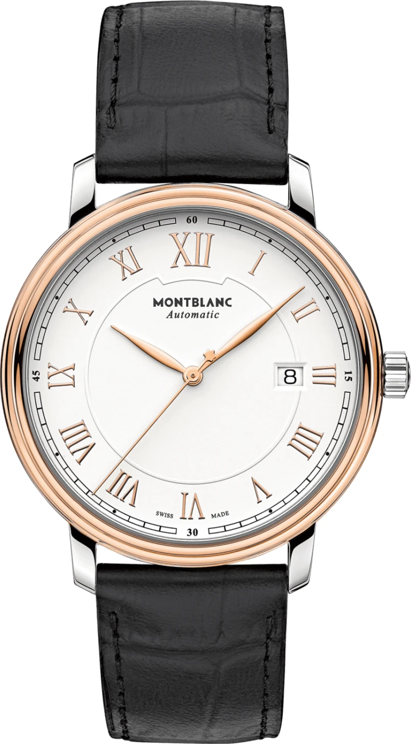 Montblanc Tradition Date Automation thể hiện cả biểu hiện thiết kế đặc biệt của Montblanc cũng như các quy tắc chế tạo đồng hồ cổ điển. Vỏ thép không gỉ với viền vàng đỏ nổi bật với các sừng thẳng Montblanc điển hình và viền hình đôi đặc biệt mới với mặt kính sapphire hình vòm. Thiết kế này thể hiện các tiêu chuẩn chế tạo đồng hồ cổ điển như mặt số màu trắng với các chữ số La Mã mạ vàng đỏ và chữ “XII” La Mã nổi bật. Bộ kim phút đường sắt truyền thống và các kim mạ vàng đỏ có hình dáng cổ điển hoàn thiện vẻ ngoài trang nhã này.