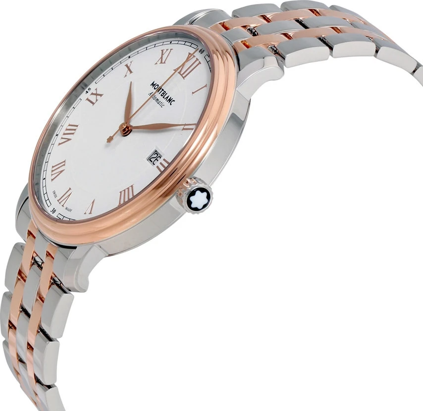 Montblanc Tradition Date Automation thể hiện cả biểu hiện thiết kế đặc biệt của Montblanc cũng như các quy tắc chế tạo đồng hồ cổ điển. Vỏ thép không gỉ với viền vàng đỏ nổi bật với các sừng thẳng Montblanc điển hình và viền hình đôi đặc biệt mới với mặt kính sapphire hình vòm. Thiết kế này thể hiện các tiêu chuẩn chế tạo đồng hồ cổ điển như mặt số màu trắng với các chữ số La Mã mạ vàng đỏ và chữ “XII” La Mã nổi bật. Bộ kim phút đường sắt truyền thống và các kim mạ vàng đỏ có hình dáng cổ điển hoàn thiện vẻ ngoài trang nhã này.
