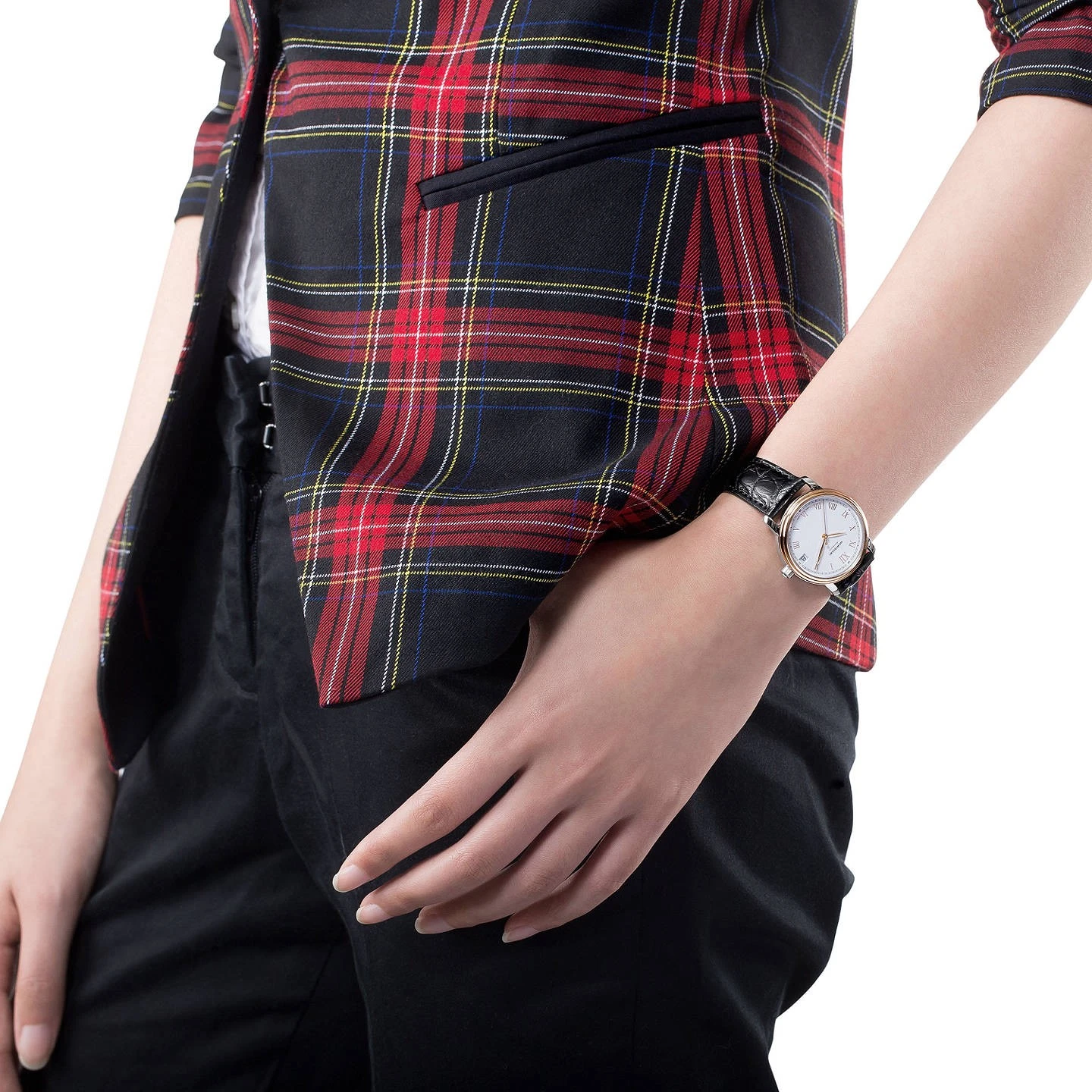 Mặt số xà cừ trắng với kim màu vàng hồng và vạch số giờ La Mã.