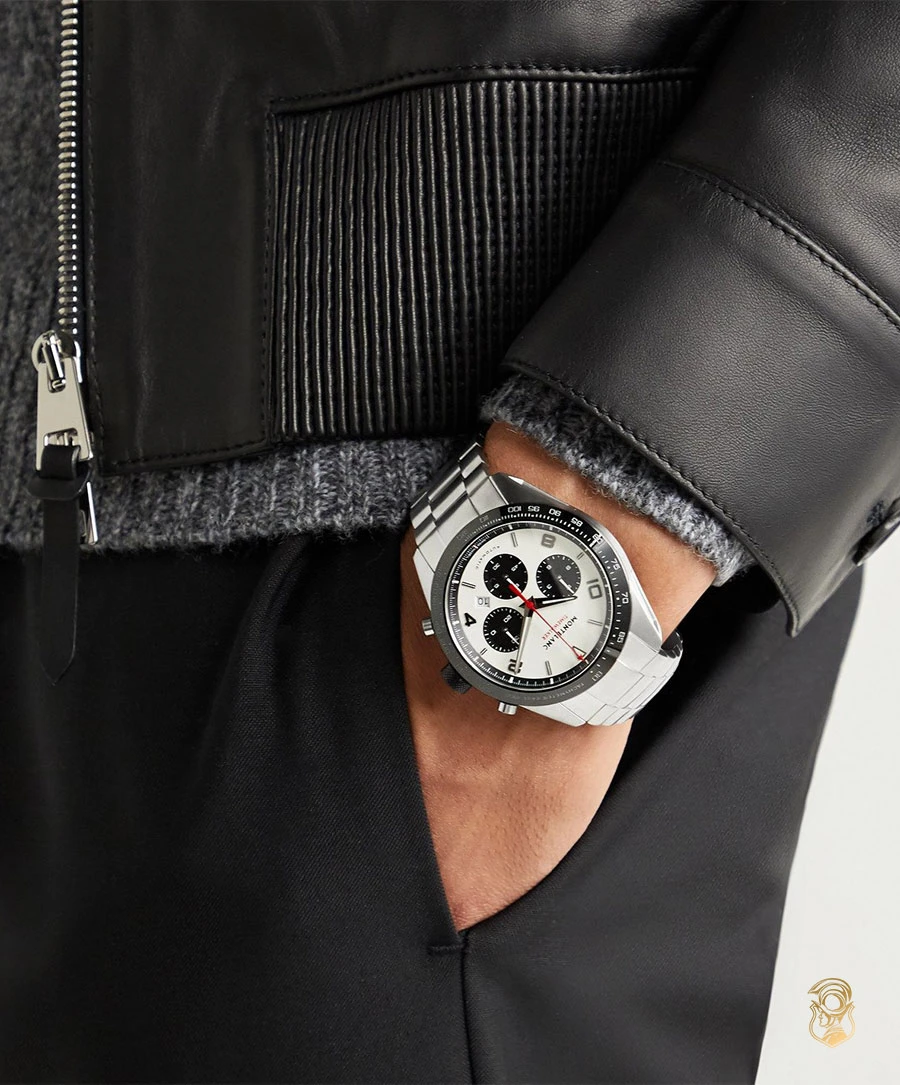 Kim giờ và phút phủ rhodium màu đen phát quang; kim giây chronograph màu đỏ; tay quầy màu trắng