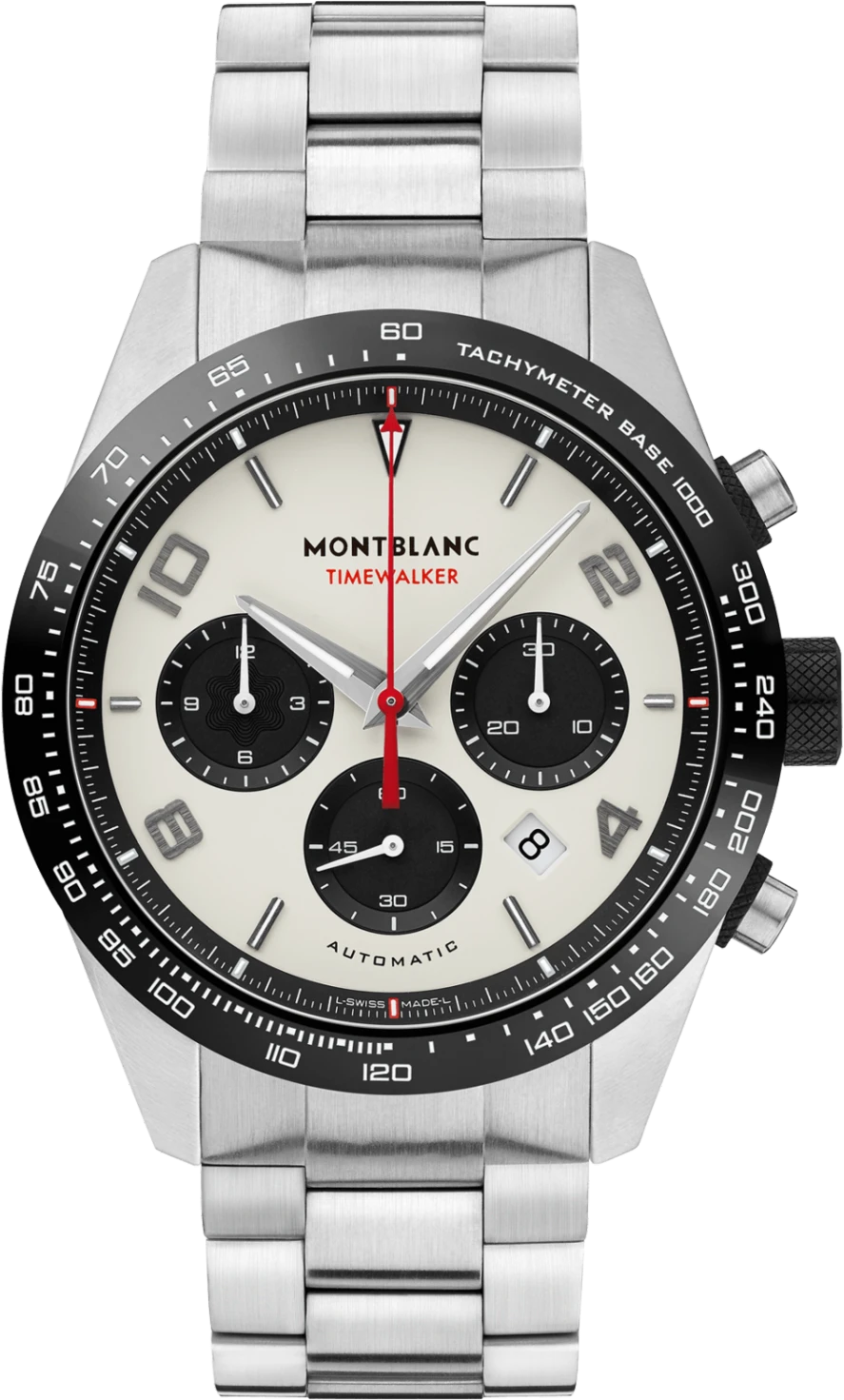 Đồng hồ bấm giờ Montblanc TimeWalker Manufacturing Chronograph mới kỷ niệm thời kỳ hoàng kim của đua xe mô tô với các chi tiết phức tạp. Mặt số với ba mặt số màu đen trên nền trắng là thứ thường được gọi là thiết kế “gấu trúc”. Sự tương phản đậm nét giữa mặt số màu đen ba chiều và mặt số màu trắng gợi nhớ đến bảng điều khiển của những chiếc xe đua cổ điển và là một trong những thiết kế mặt số hấp dẫn và dễ nhận biết nhất. Vỏ thép không gỉ 43 mm đã được hoàn thiện bằng sa tanh để mang lại vẻ ngoài ô tô và khả năng chống trầy xước tốt hơn. TimeWalker Sản xuất Chronograph được trang bị viền đen cố định mới được khắc thang đo tốc độ tachymeter được làm bằng gốm đen công nghệ cao sáng bóng để mang lại độ chắc chắn, độ bền và hiệu suất tối đa. Đồng hồ được trang bị bộ máy bấm giờ Calibre MB 25.10 hoàn toàn mới của Nhà sản xuất với cách hoàn thiện truyền thống như Côtes de Genève, vân tròn, ốc vít màu xanh và trọng lượng dao động monobloc mới làm bằng vonfram mạ rhodium màu đen và được thiết kế theo hình vô lăng. . Bộ máy được trang bị bánh xe cột truyền thống, khớp nối ngang cũng như cơ chế dừng giây, cho phép cài đặt thời gian chính xác.